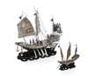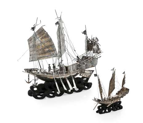 three masted decorated full sails, figures and rigging, mounted on a carved wood base imitating waves, together with a smaller version (2)