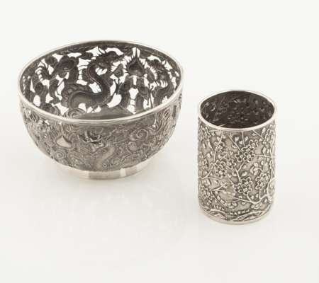 of circular outline, with pierced and engraved detail of dragons to body, to a plain foot, with character marks, Wang Hing, 90, to base; together with a small Chinese beaker with embossed foliate detail to body signed Wang Hing to base (2)
