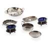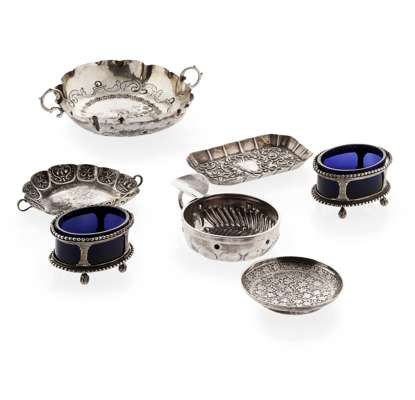 to include a wine taster, French control marks; two small pin trays; a pair of oval salt frames, Amsterdam circa 1880, with blue glass liners; a two handled dish, Hanau, circa 1880, embossed figural decoration; an Eastern silver circular dish, unmarked; a small basket with swing handle, unmarked (qty)