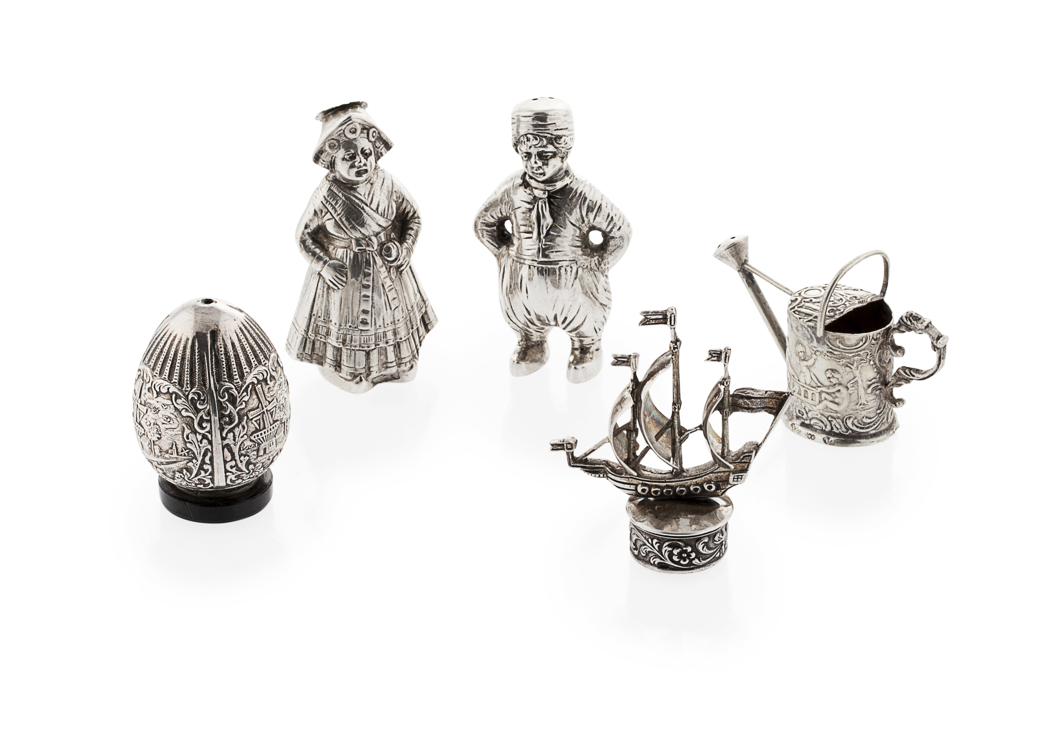 to include; a Dutch boy and girl salt and pepper; a small nef; a watering can; a salt pot, various marks, primarily late 19th, early 20th century (qty)