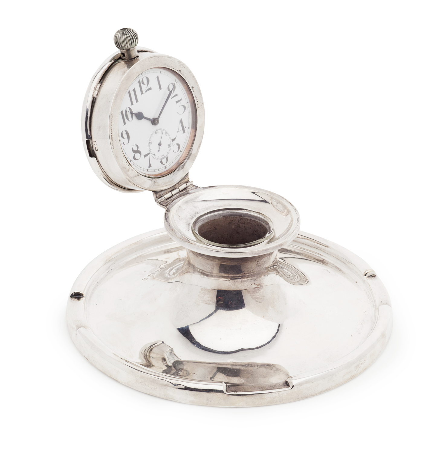Birmingham 1917, of capstan form, the hinged lid lifting to reveal a white faced watch and glass insert inkwell