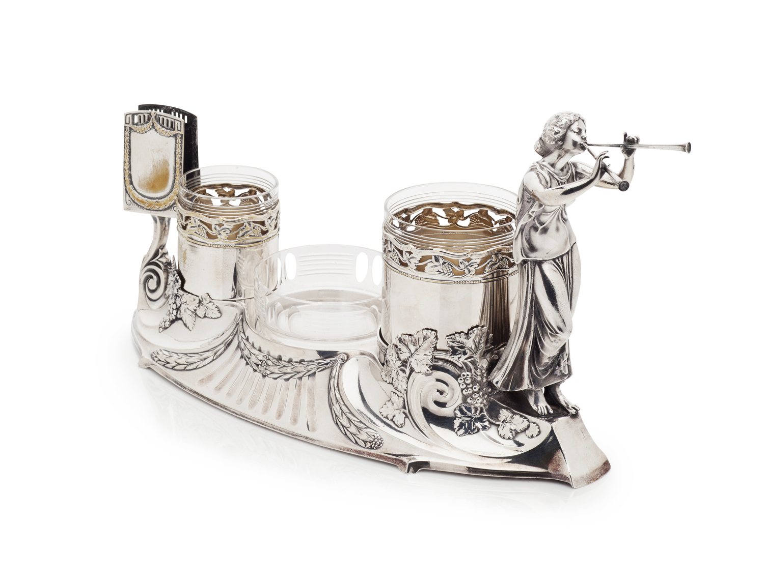 WMF, circa 1915, of belle epoque style, comprising a shaped oval base cast with foliage and berries, fronted by a maiden carrying two horns and containing three glass containers, two with plated metal surrounds