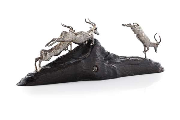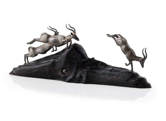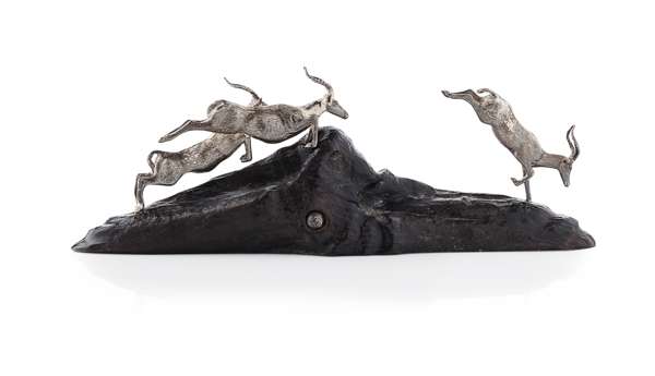 of running and jumping Thomsons Gazelles, on natural wood base, inset PM motif
