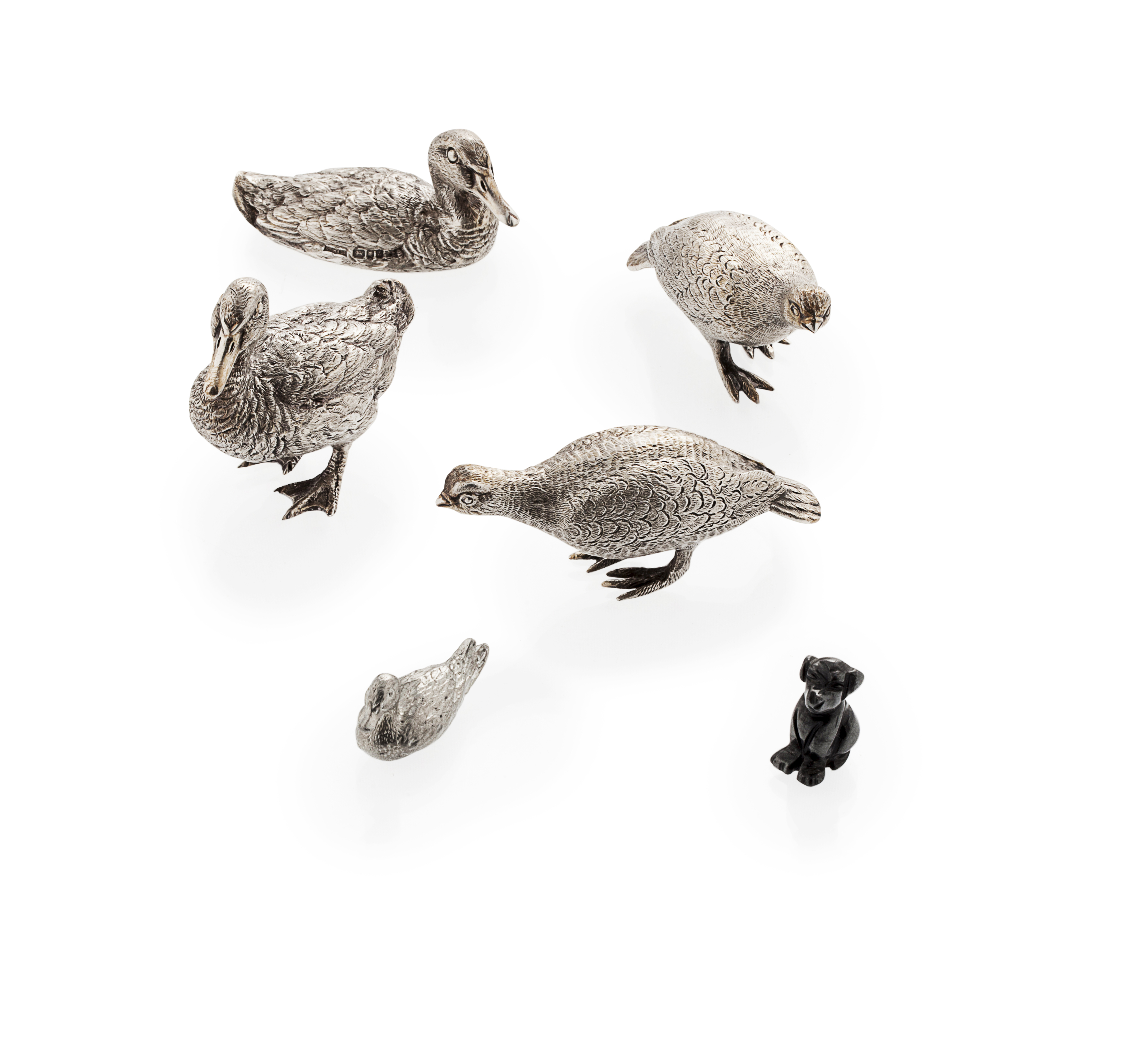 modern, cast in naturalistic form comprising: a brace of grouse; duck; drake and duckling (qty)