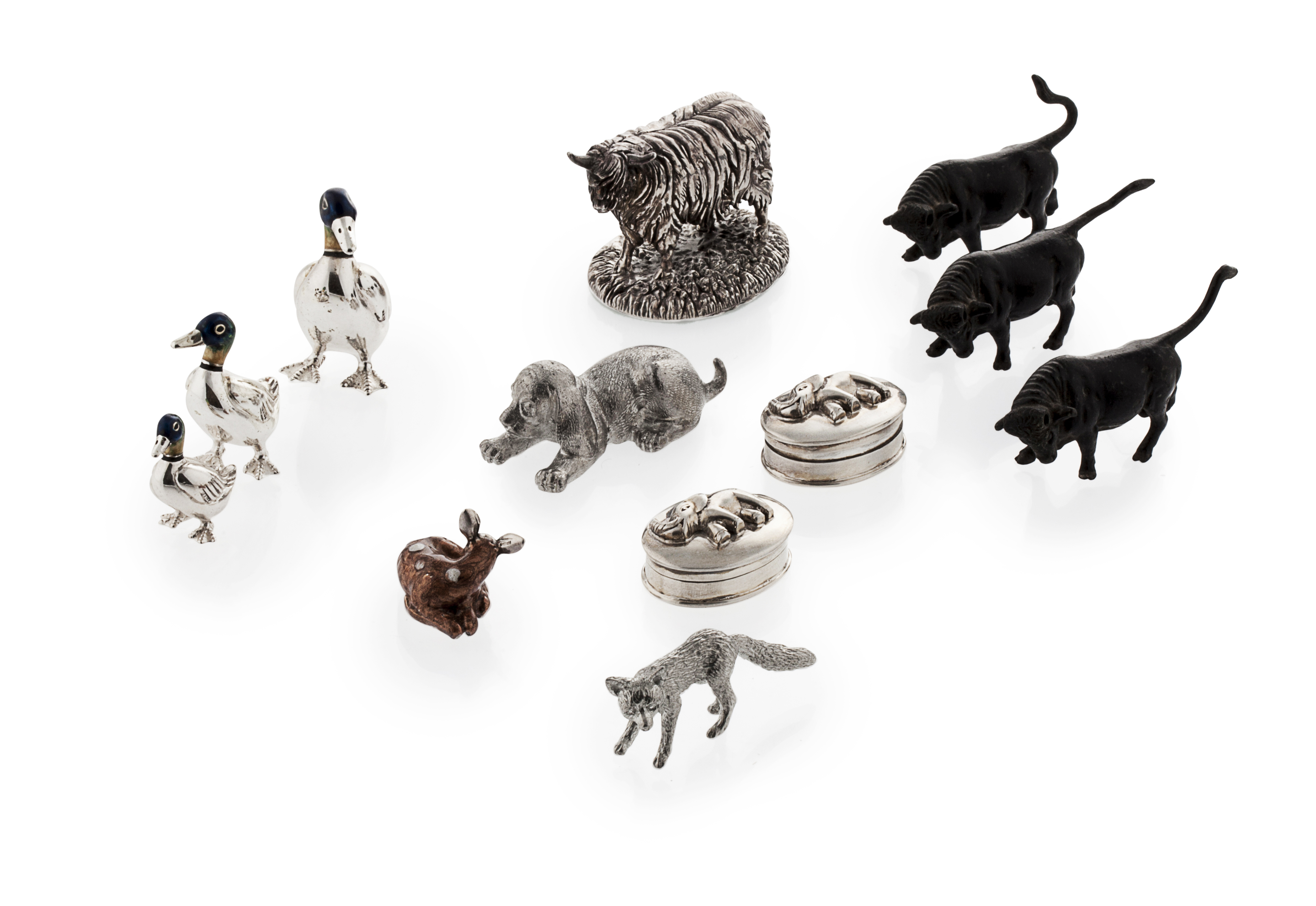 modern, in natural poses, comprising: a family of ducks with enamel detail; a young deer; a fox; a Highland cow; two patch boxes; together with three bronze bison; ONE dogs and a fox (qty)