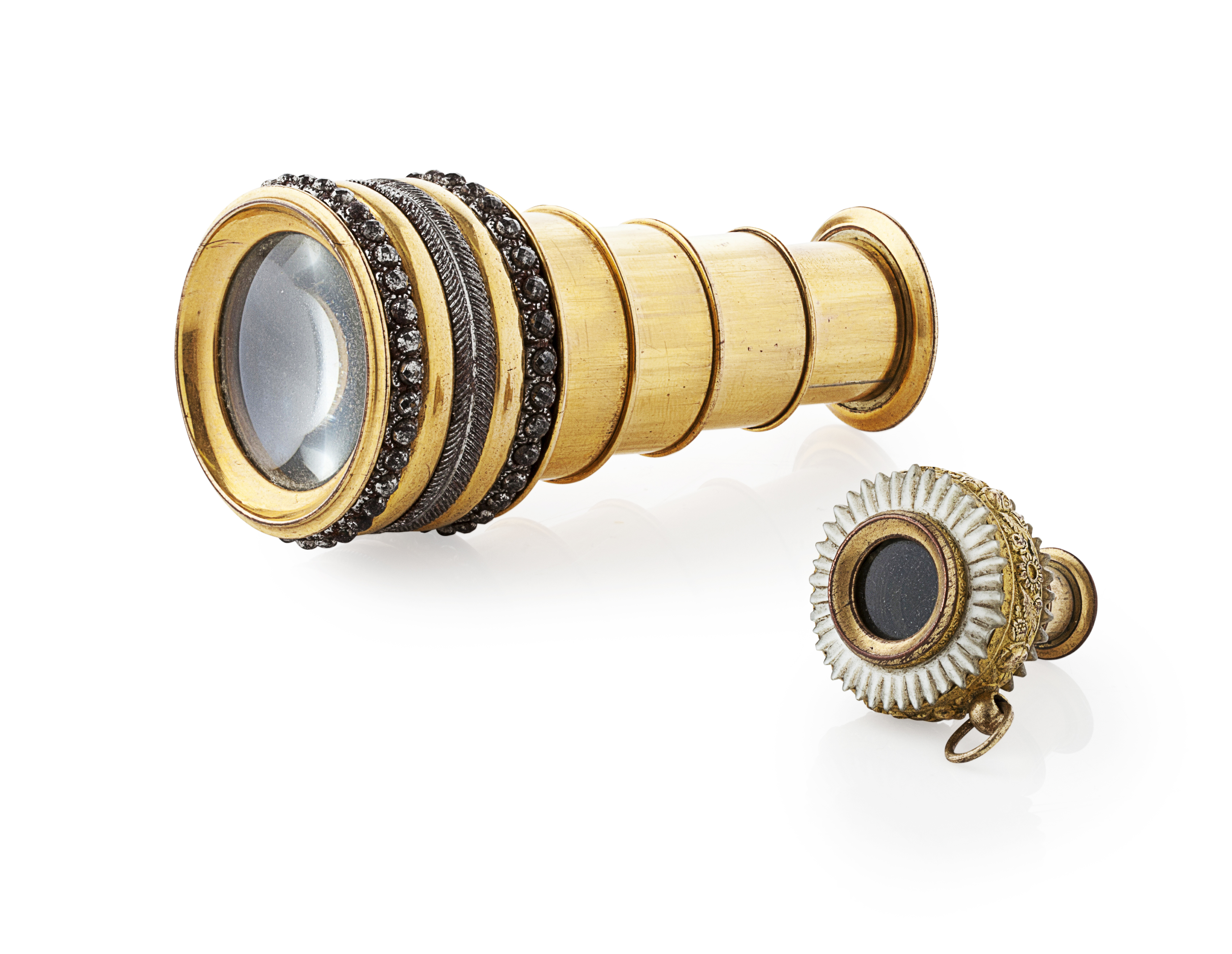 the first unmarked with four draws, the main barrel with silvered metal band and faux facetted 'gems'; the other of pendant miniature form, unmarked, gilt metal, mother of pearl panels, ring suspension (2)