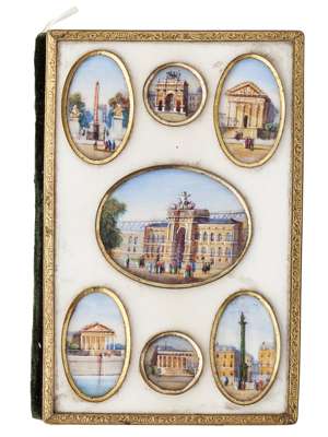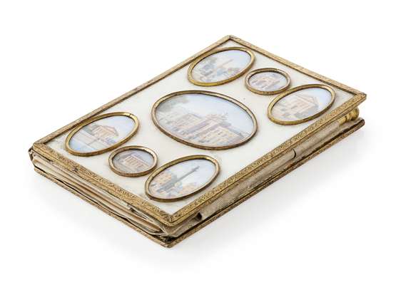 the ivory cover with seven inset Indian ivory miniatures painted with classical Indian buildings, applied plaque to rear cover, moire silk lined interior with note-book, gilt propelling pencil