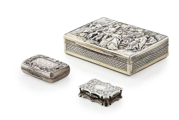L&Co, Birmingham 1819, of rectangular form, parcel gilt lid decorated with an assembly of a monarch and figures; two small snuff boxes, one a vinaigrette, chased border, engraved border and decoration (3)