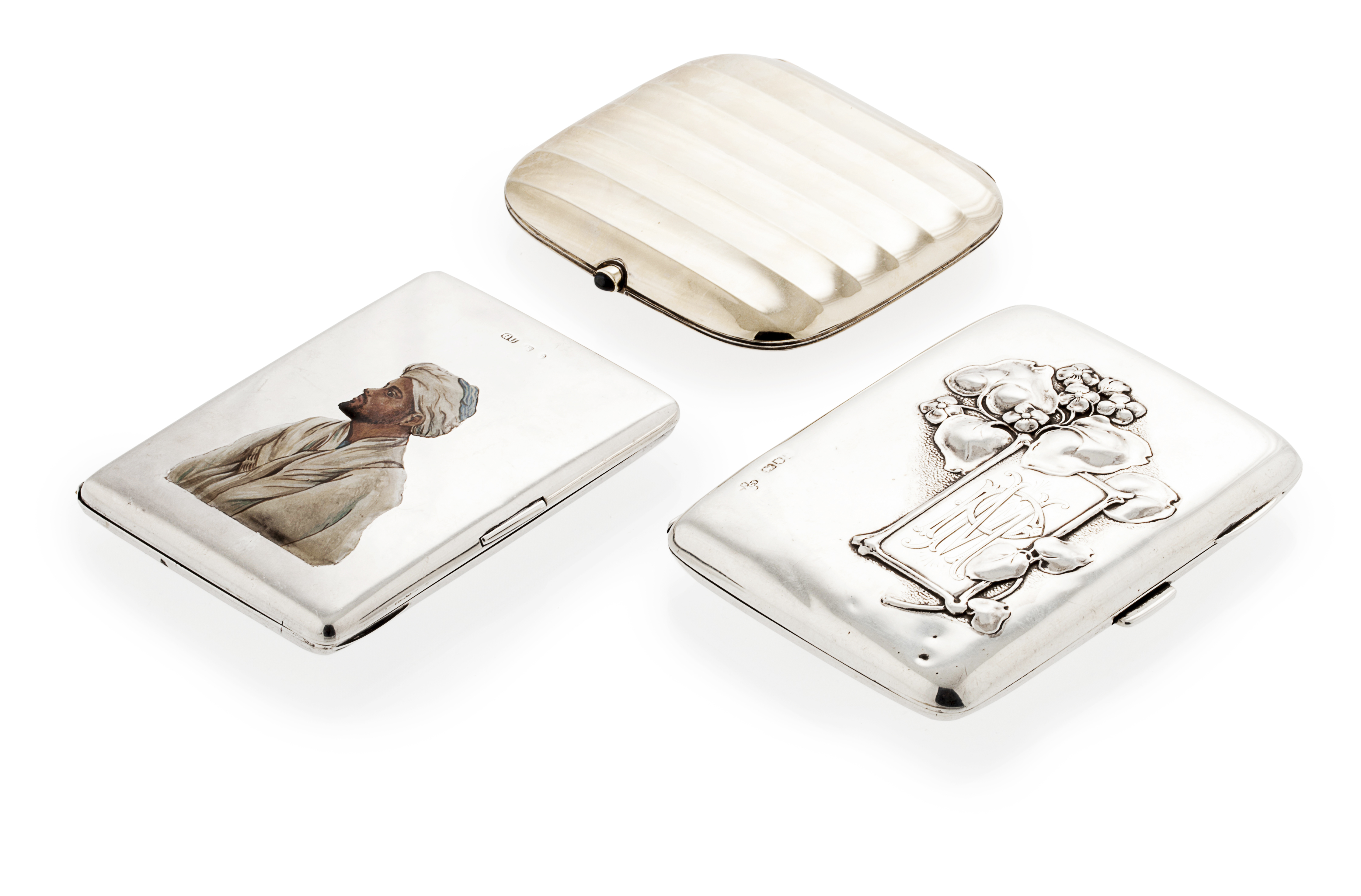 the first George Unite, circa 1888, of plain rectangular form with enamelled picture of an Arab in traditional dress, leather fitted interior; another similar note case, decorated tablet with Art Nouveau floral surround; and a silver gilt cigarette case, ribbed body, small cabochon thumbpiece (3)