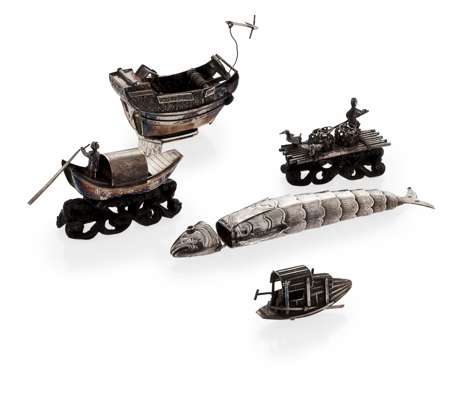 to include an articulated fish, engraved sections, Berthold Muller; a Chinese silver raft with birds, baskets and raised on a small carved wood stand modelled as waves; a small junk; a larger junk with oars man and raised on a carved wood stand modelled as waves; a larger ceremonial Chinese boat with anchor, engraved decoration to the sides, seal mark to base (qty)