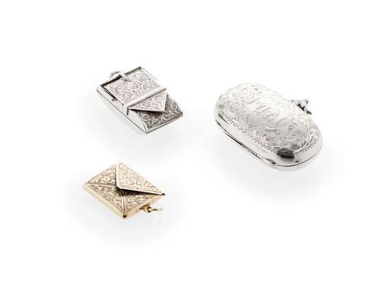 AEJ, Chester 1910, formed as an envelope, engraved decoration together with: a sovereign and half sovereign case, JG, Birmingham 1907, of rounded rectangular form, allover decoration; an unusual locket, unmarked, possibly colonial, formed as a buckle hinged cover enclosing an interior with two oval inset sections, the rear plain (qty)