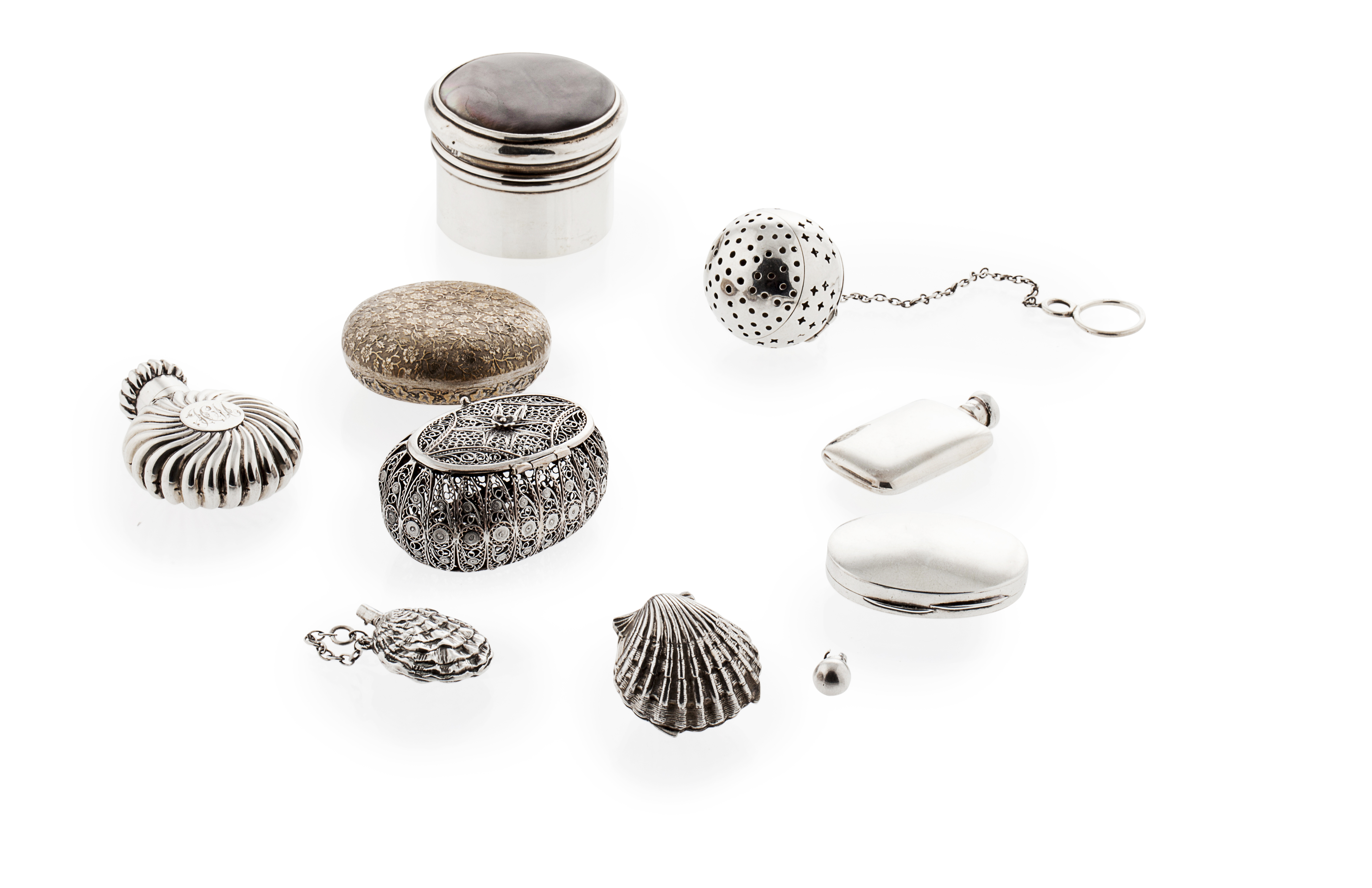 to include a filligree oval box and cover; box and cover, with inset abalone to the cover; oval engraved patch box; tea infuser; gilt box; clam shell box and cover, oyster shell bottle and cap; two other scent bottles (9)