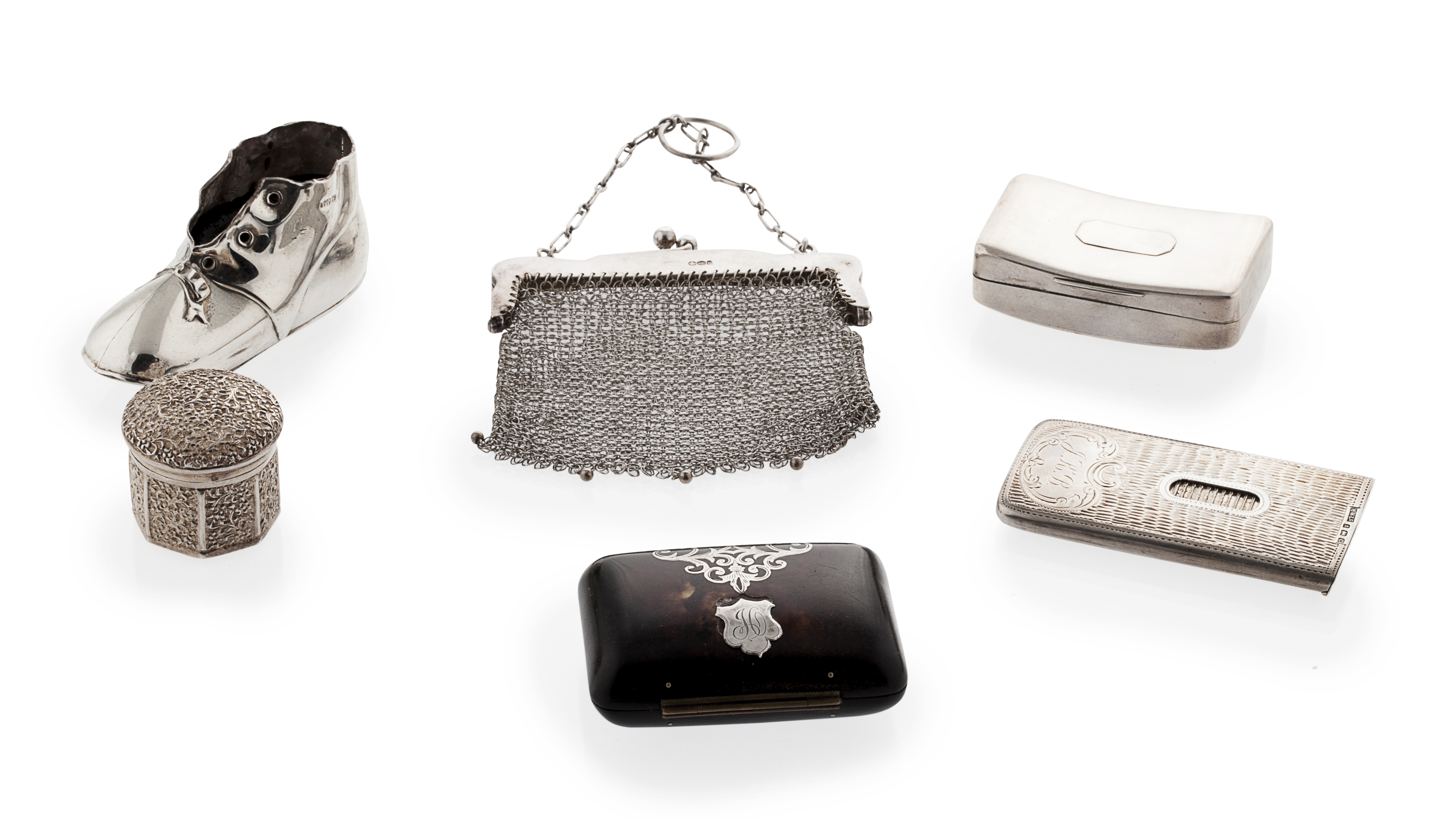 to include a snuff box, John Shaw, Birmingham1811, of curved rectangular form; a chain mail small purse; a patch box; a shoe pin cushion; a slim vesta case, engraved cartouche and a small tortoiseshell purse with silver mounts, fitted interior (6)