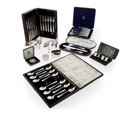to include two sauce boats; cased pair of Walker and Hall napkin rings; another napkin ring; cased Victorian christening set; Charles and Diana silver commemorative crown; set of Edwardian tea knives; cased set of fruit eaters; set twelve teaspoons and tongs; a hip flask sleeve (qty)