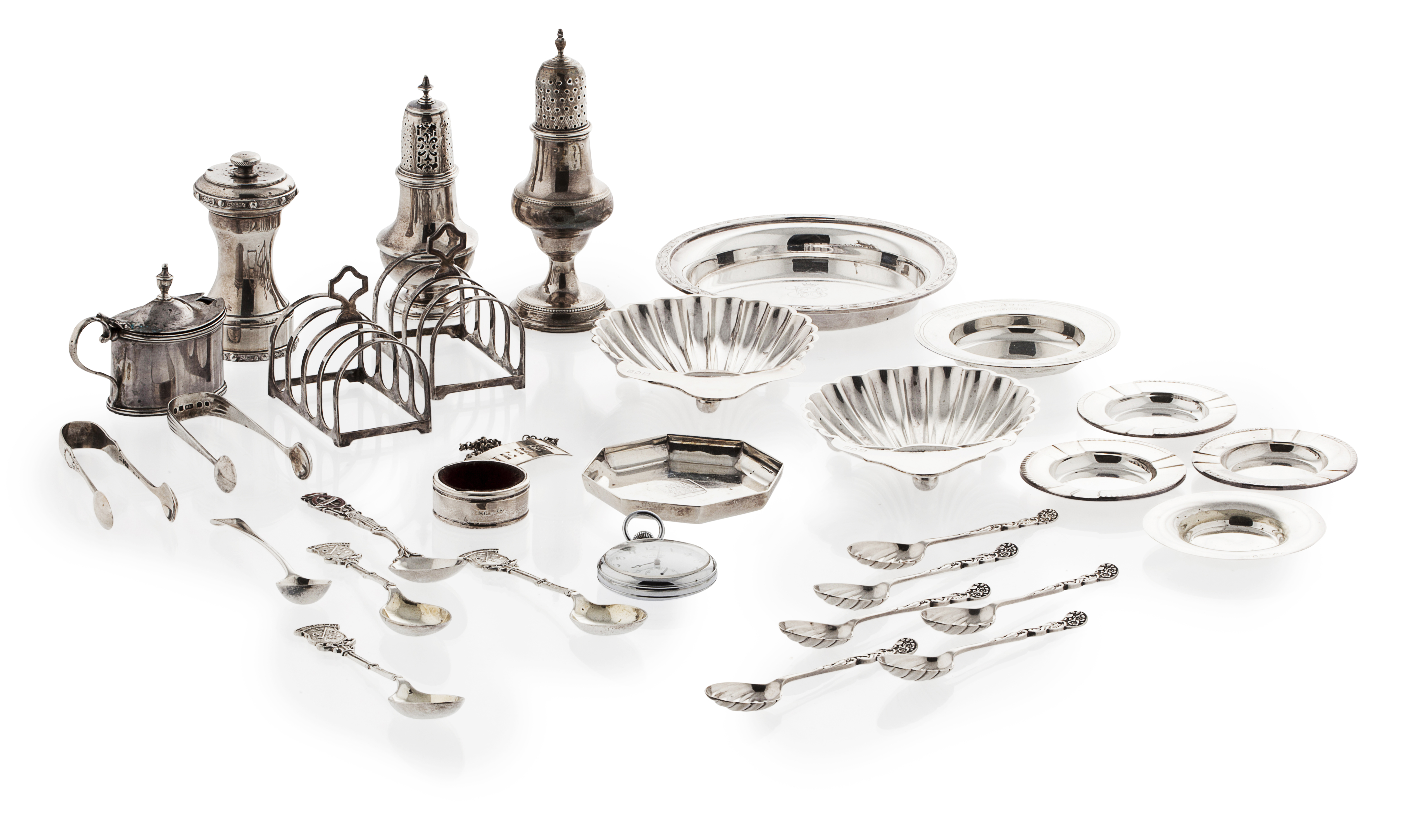 to include two Georgian pepperettes, a capstan pepper grinder, cased pair of shell dishes, set tea spoons and tongs, various ashtrays, spirit labels, travel clock, mustard pot, pair toast racks etc (qty)