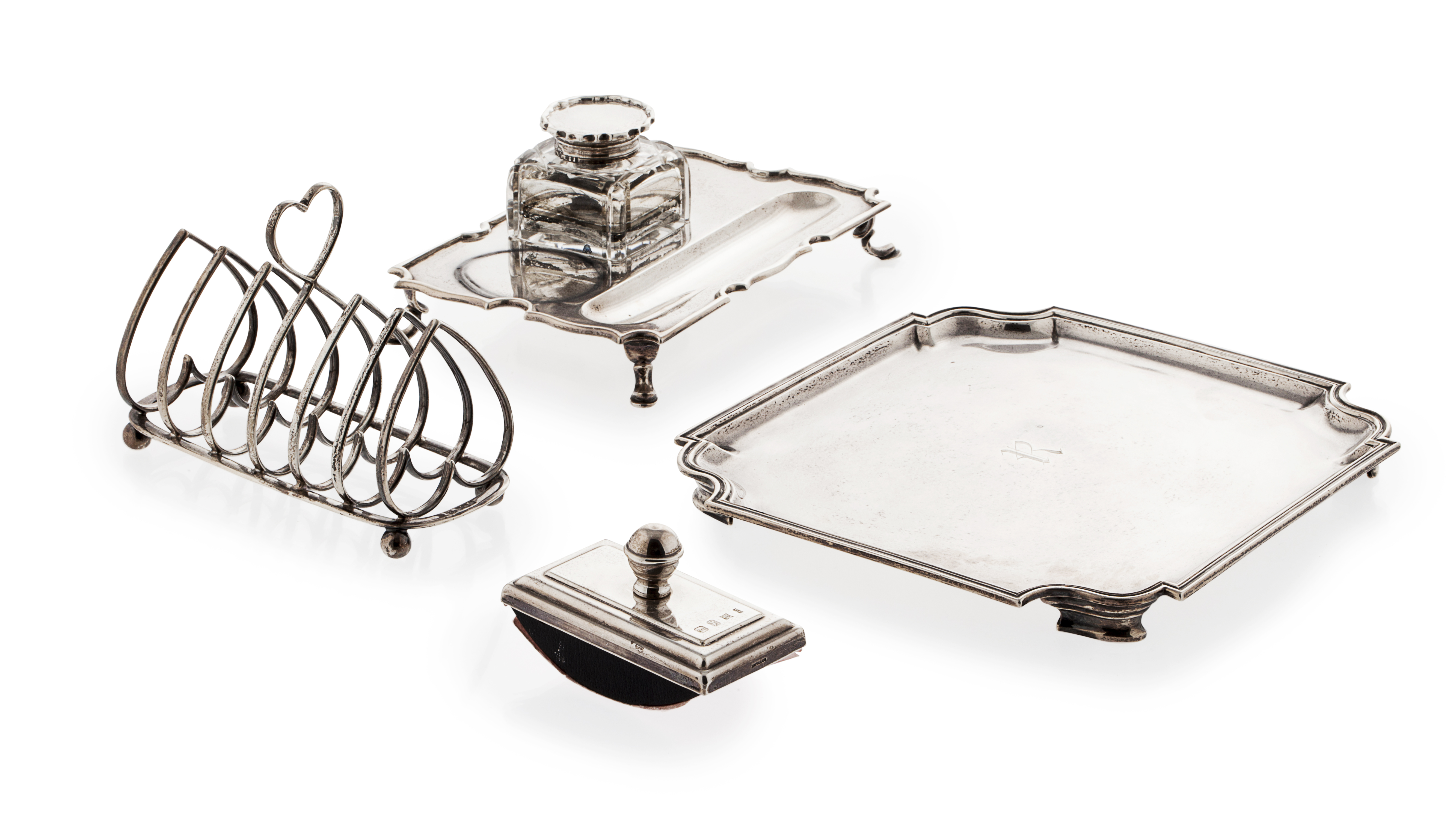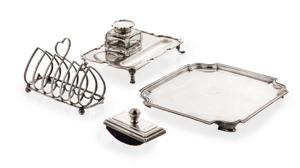 to include a desk inkstand, Goldsmiths Company, London, of serpentine outline, single inkwell and a pen recess, all on hoof feet, with an associated blotter, a square salver, engraved initial and a six division toast rack