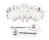 import marks for 1950s, comprising: ten dessert spoons; eight soup spoons; six coffee spoons; six grapefruit spoons; eight table knives; eight table forks; eight dessert forks; two serving ladles; caddy and jam spoon (qty)