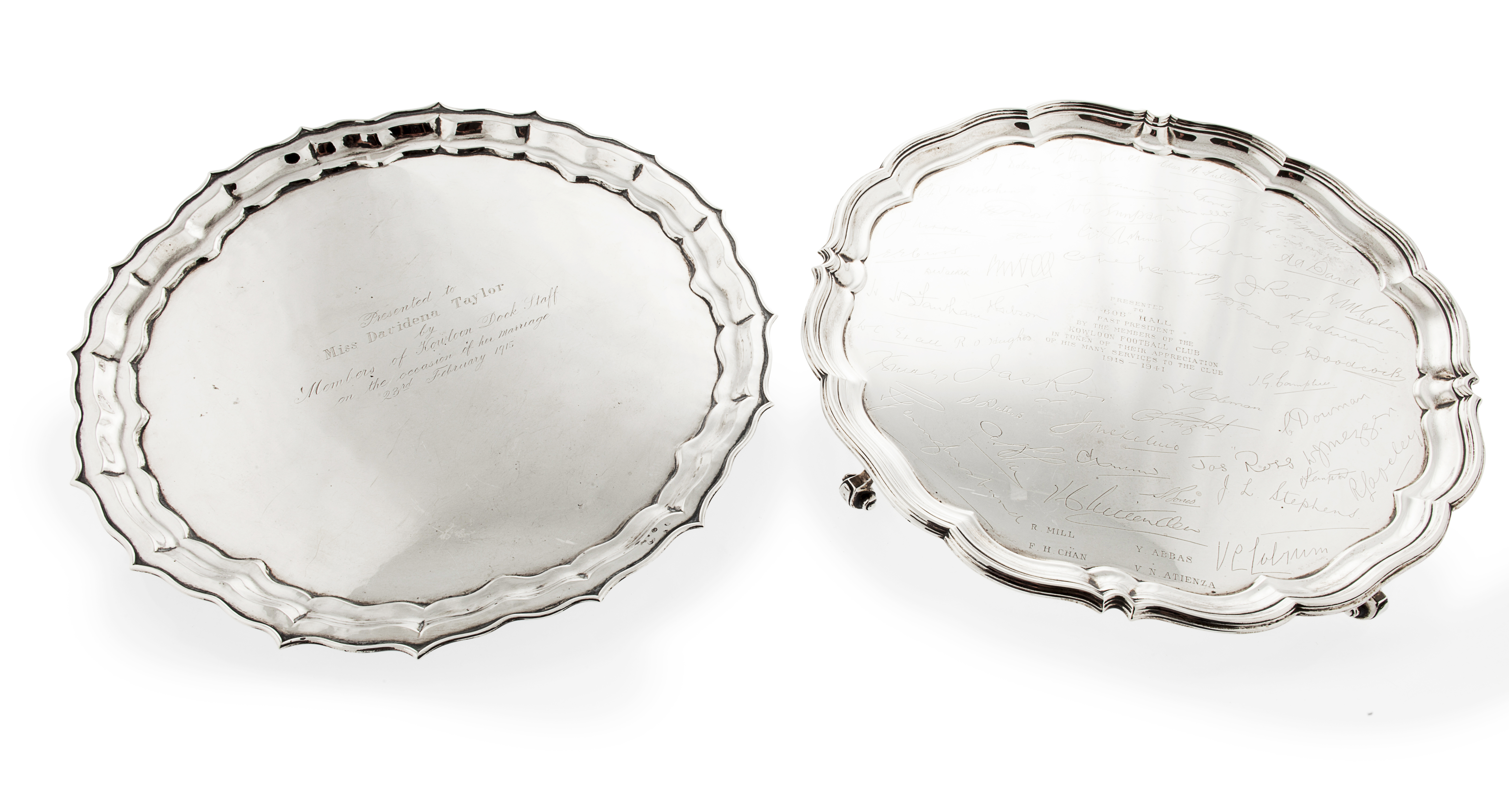 Sheffield 1940, Wang Hing circa 1910, each of lobed circular form, engraved inscriptions, scroll and disc feet (2)