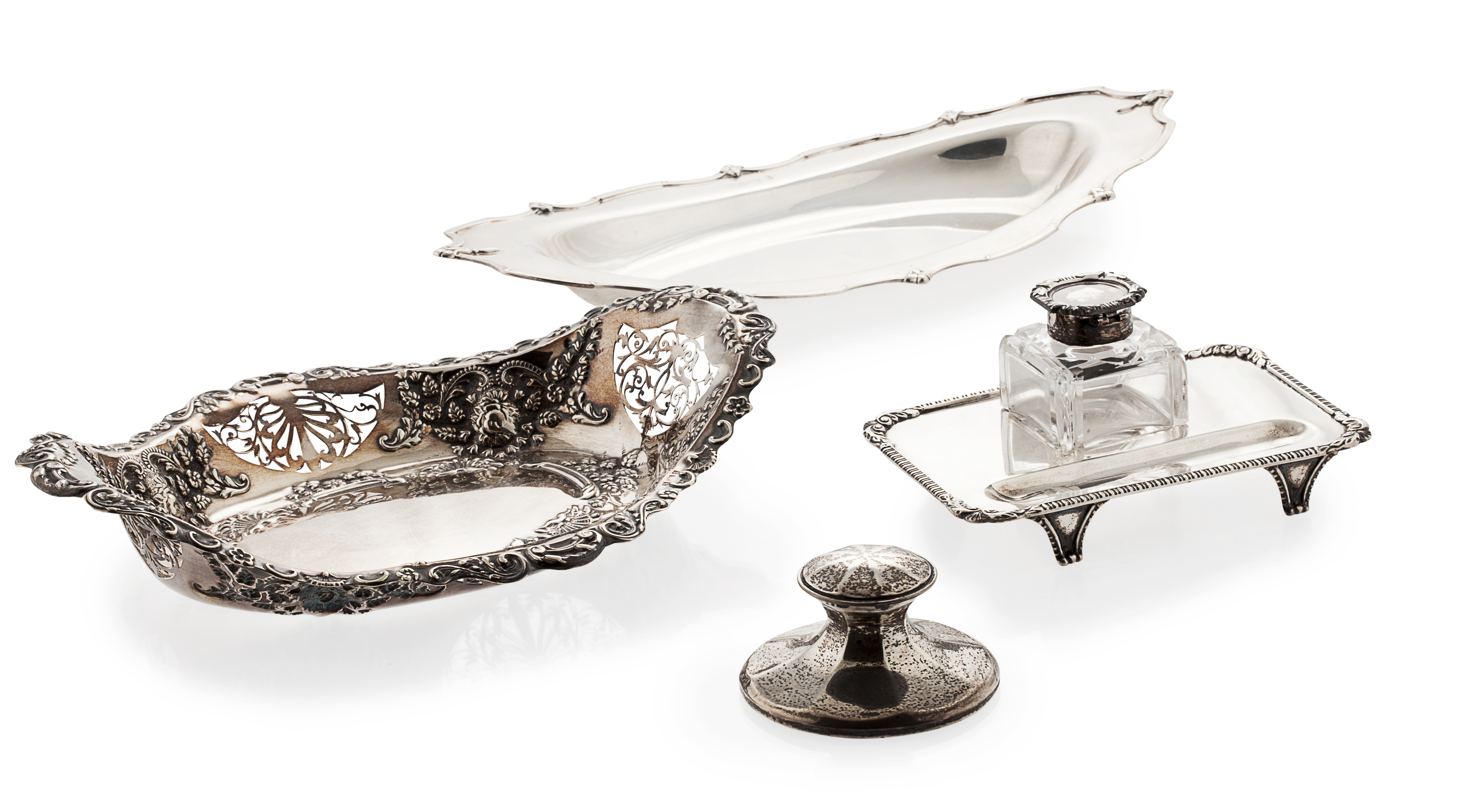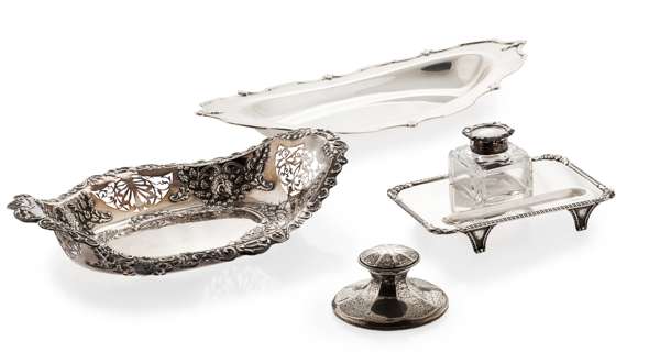 London 1905, of rectangular form, cast gadroon border; together with a small capstan inkwell; a large oval basket, chased and pierced decoration; another elongated oval dish. moulded border (4)