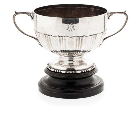 Hamilton & Inches, Edinburgh 1902, of two handled form, angular, demi-ribbed, engraved monogram, pedestal foot, with a wood base