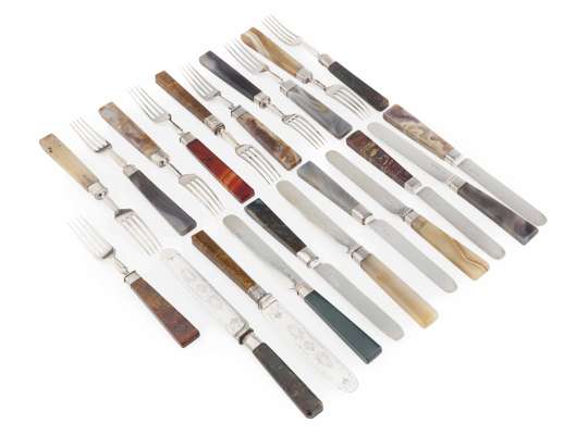 A matched set of 19th century hardstone handled fruit knives and forks
