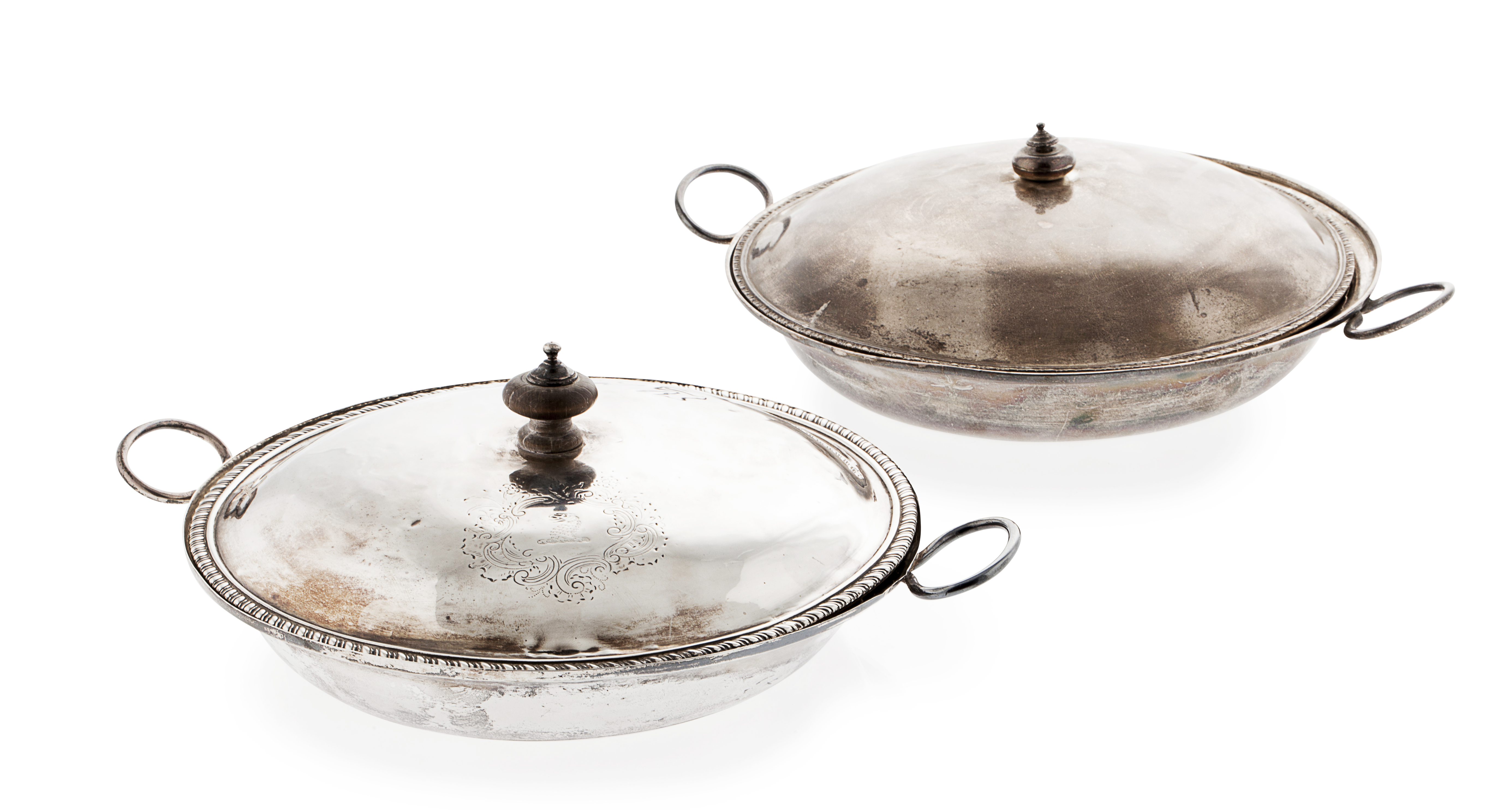 Mixed dates, part marked, engraved crests, the bases with two simple loop handles, the covers plain gadroon rim, engraved cartouche to one