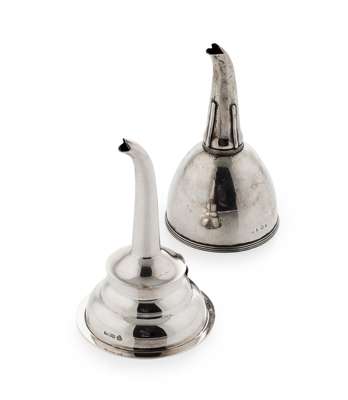 marks worn, plain engraved crest, strainer lacking, together with another wine funnel, C J Vander, Sheffield, of traditional form (2)