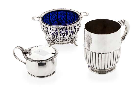 W J Barnard, London 1898, of demi ribbed form, engraved monogram and dated 1898, bold threaded handle; together with a George IV mustard pot, circa 1830, serpentine gadroon rim; and a two handled sugar basin, pierced frame of bombe form, blue glass liner, scrolling volute feet (3)