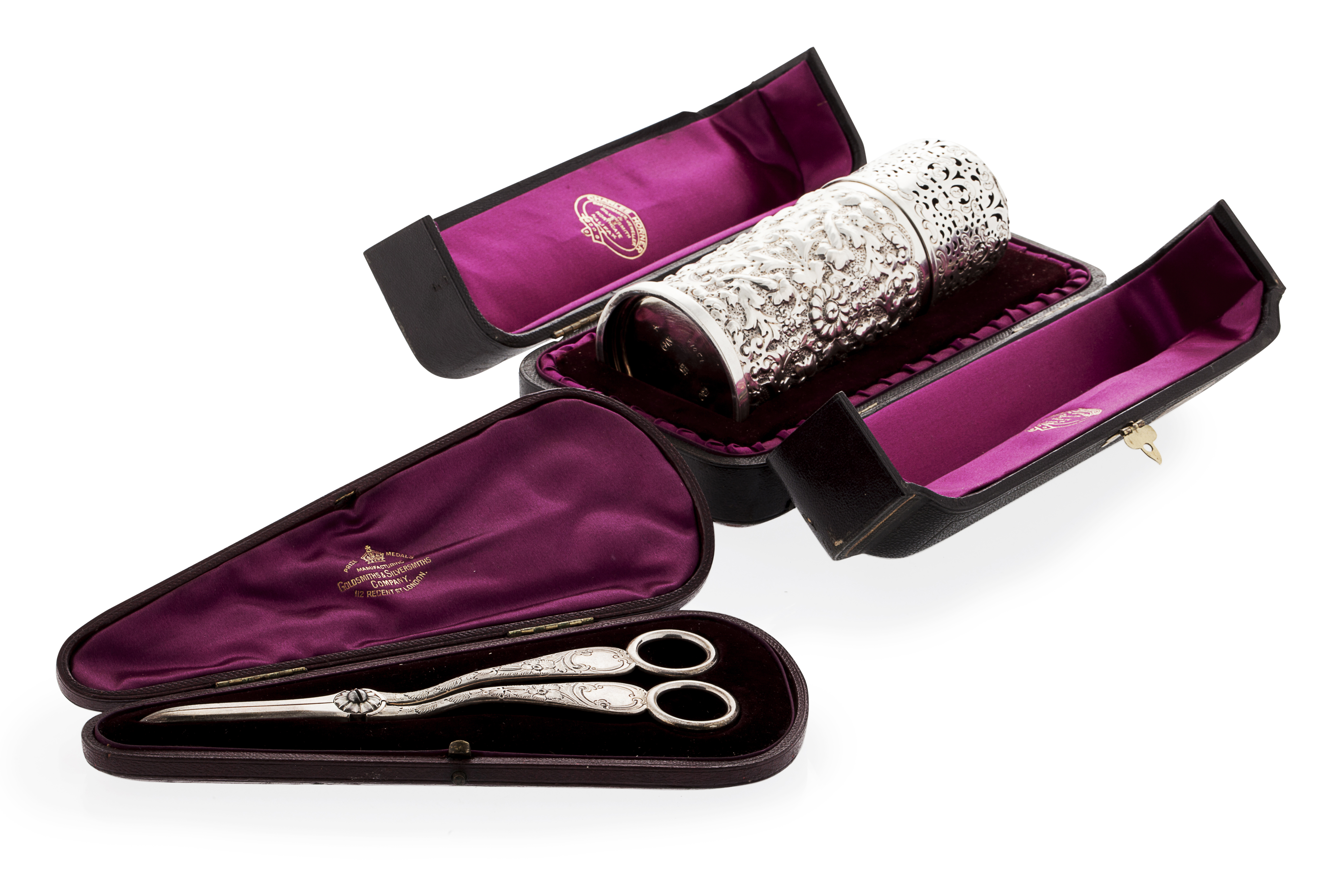 EF/HT, London 1895, of cylindrical form, pierced cover, foliate decorated body, in a Charles Horner retailer fitted case, together with a cased pair of grape scissors, London 1893, of conventional form, also in a fitted case (2)