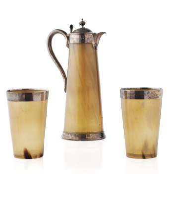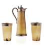 Charles and George Asprey, London 1890, the tapering body with plain scrolling silver handle, silver rim, engraved and dated 1891, turned finial, the beakers plain with silver rims to top and bottom, glass bases (3)