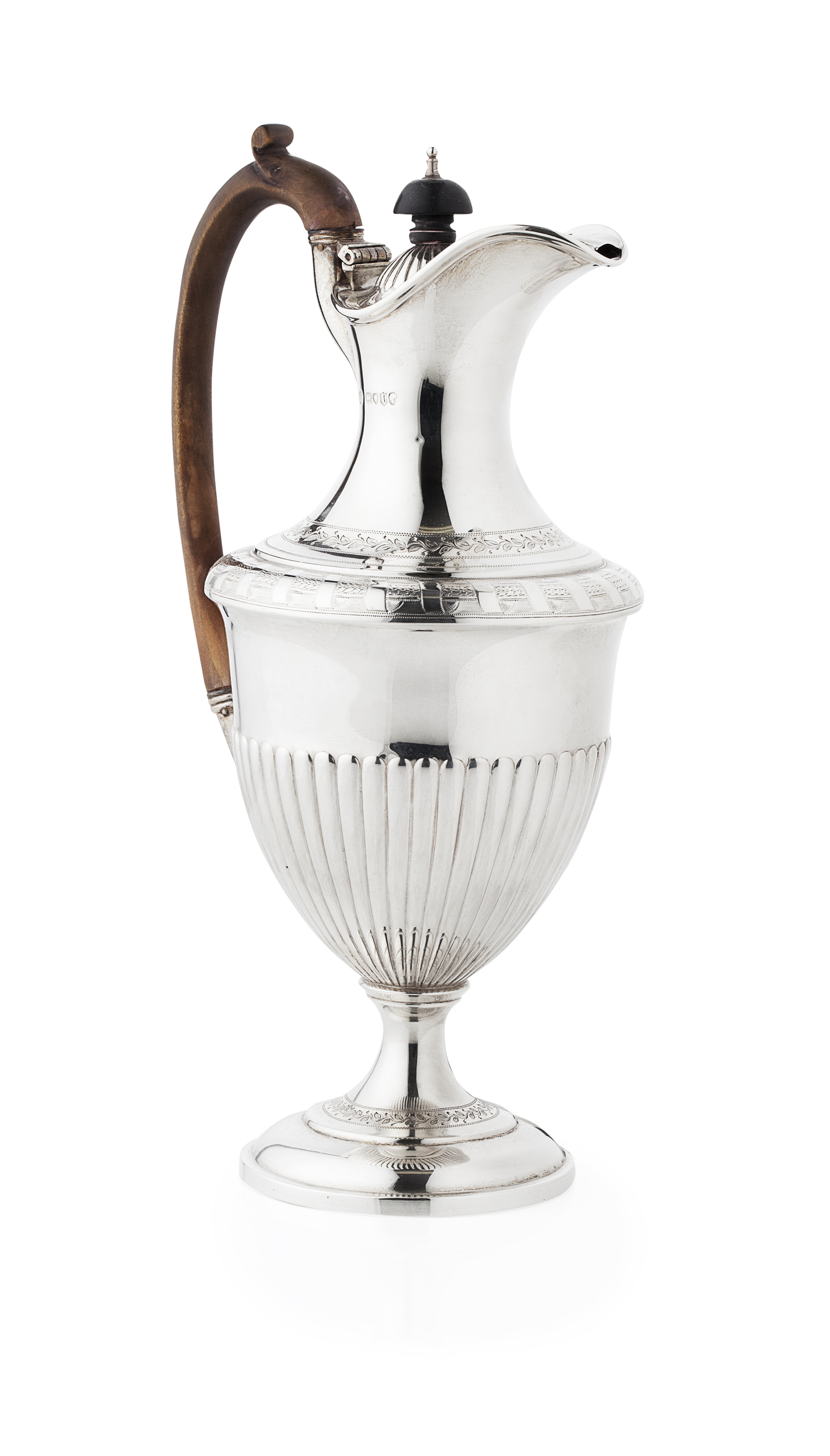 W J Barnard, London 1886, of vase form, hinged cover, tall scrolling wood handle, the vase shaped body with engraved bands and demi-ribbed, spreading foot