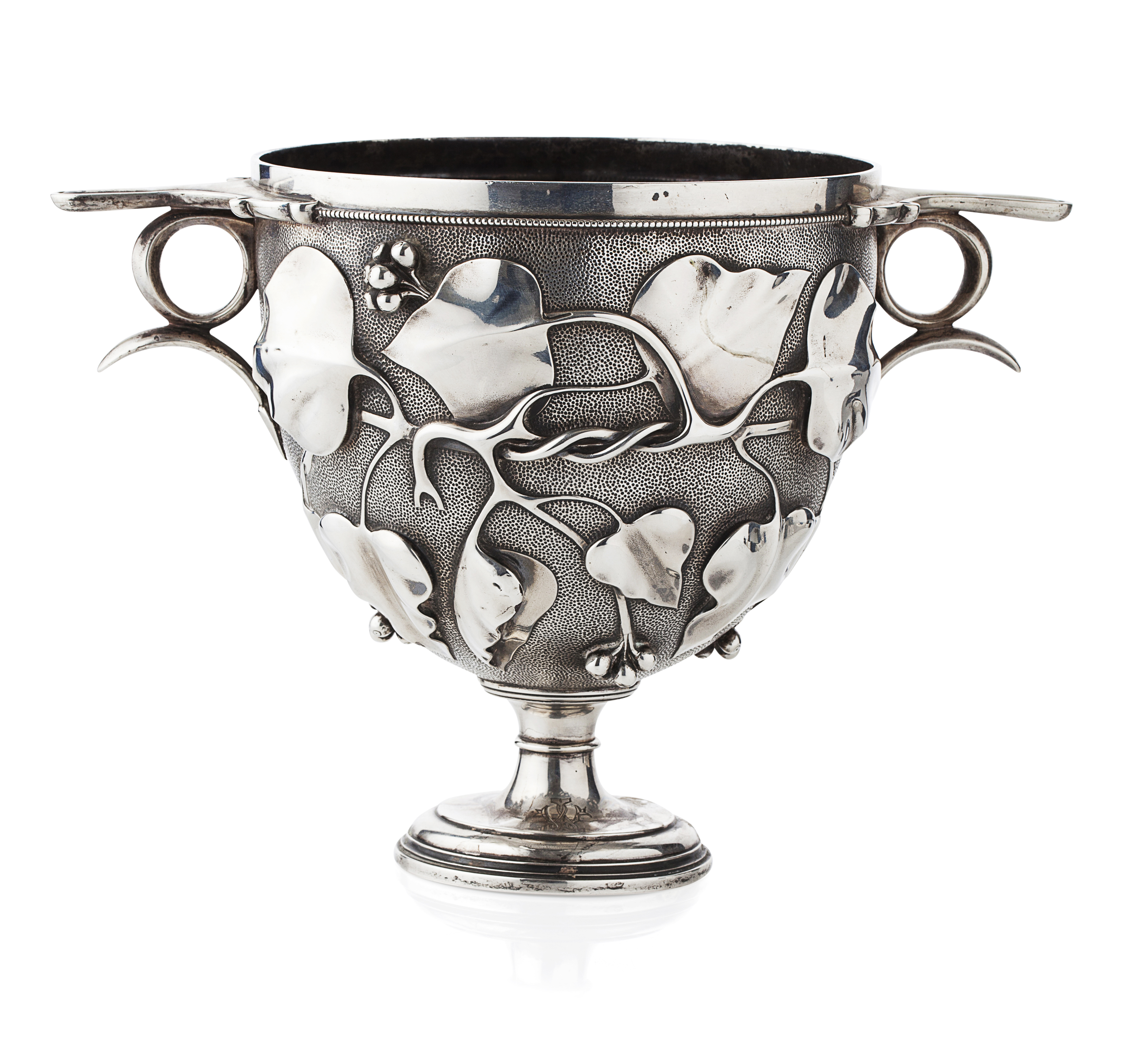 Walter and John Barnard, London 1885, the demi spherical body with matted finish, bold applied vine leaf and berry decoration, lug and ring handles, all raised on a pedestal foot, retailed by Edwards of Glasgow and London