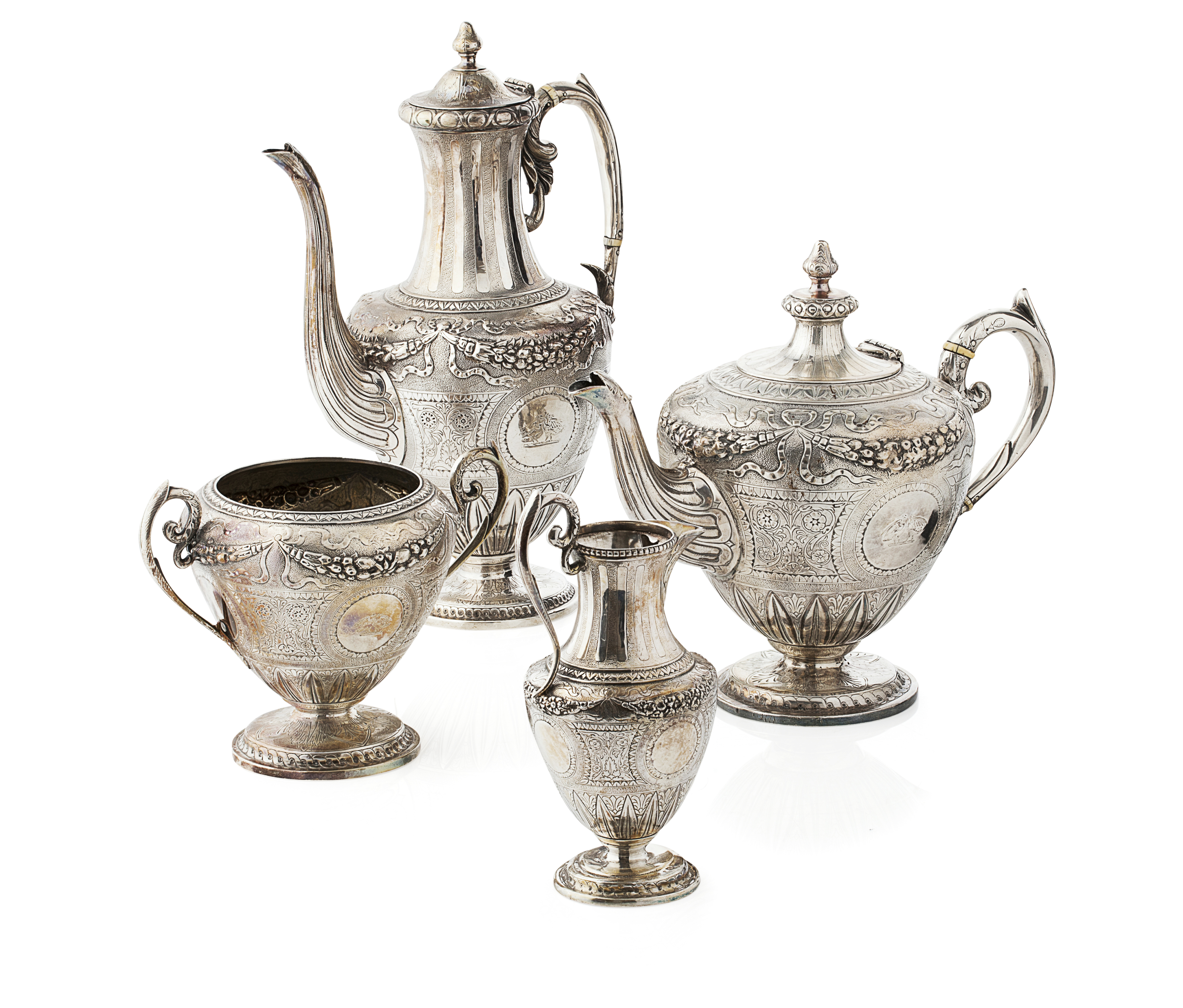 James Mackay, retailed by Mackay and Chisolm, Edinburgh 1866, of inverted baluster form, matted ground, all over ribbon swags, and floral garlands, cartouche with engraved crest, leaf clasped scroll handles, leaf border, pedestal foot, comprising, a teapot, coffee pot, sugar and cream (4)