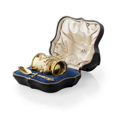 JM & S, Glasgow 1865, baluster shaped mug, 'C' scroll handle, the body with applied figure of horse woman riding side saddle, c scroll panel decorated fruit and another cartouche with engraved inscription, together with a spoon, WC, Glasgow 1868, matching decoration, both in a fitted case for Brook and Son