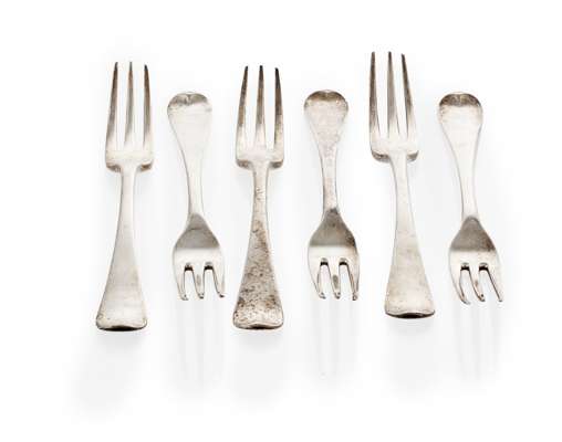 A set of six three pronged forks