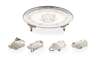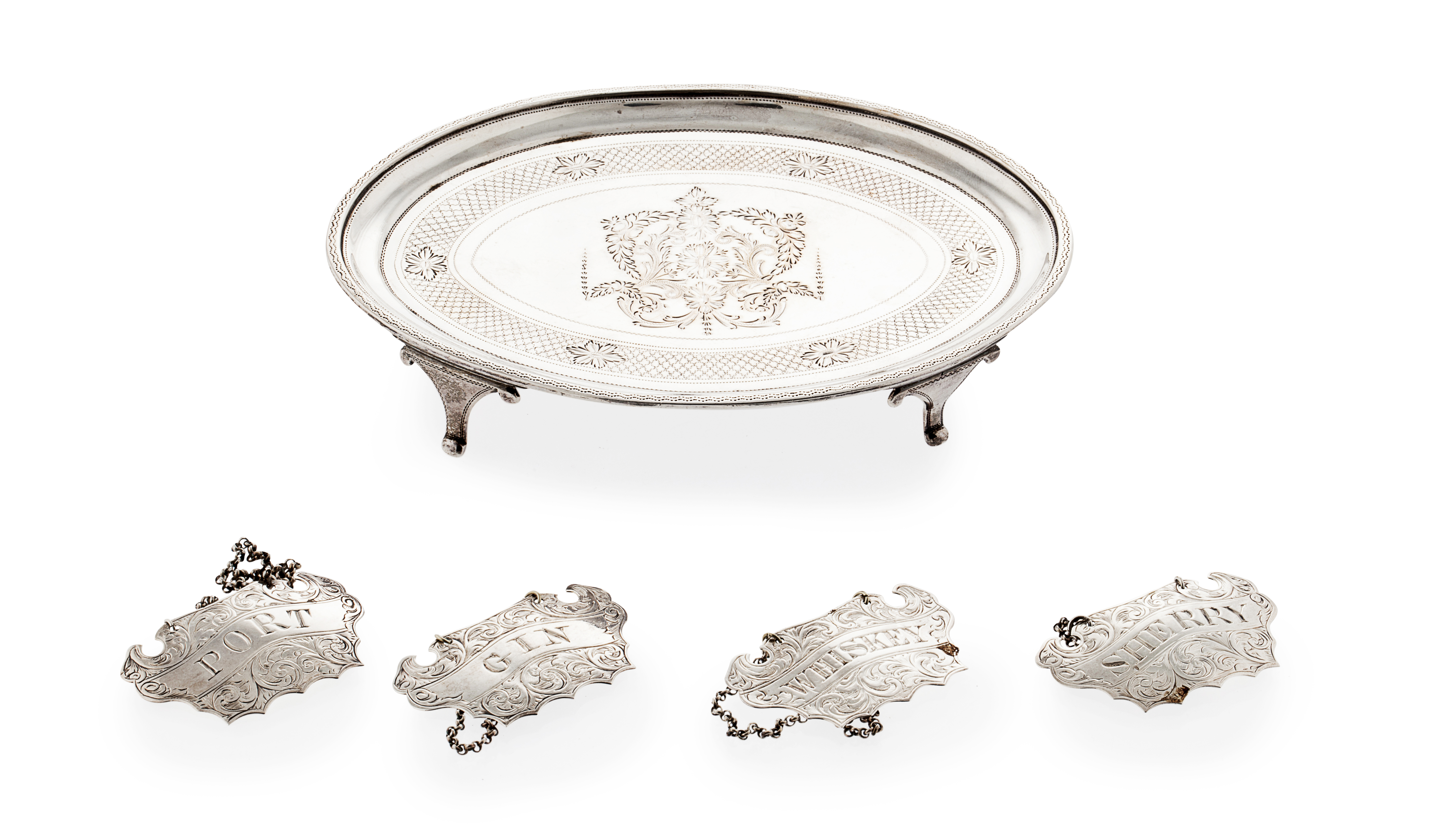 A.F, London 1797, of oval form, later engraved flat, raised on four feet, together with a set of four Victorian wine and spirit labels, John Tongue, Birmingham 1865, shaped form, engraved names, chain suspension