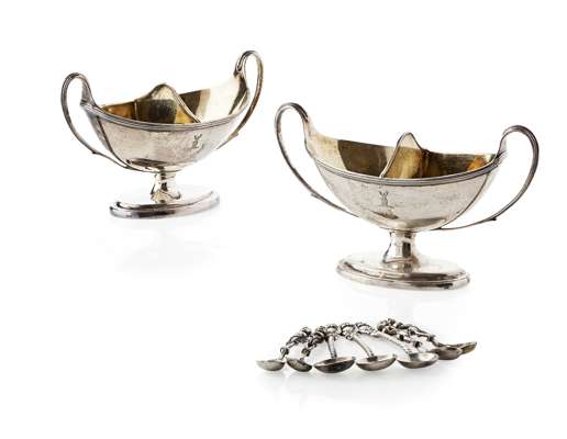 W.P., London 1792, of oval form, moulded edge and loop handles, divided interior, engraved crest, oval foot, together with a set of four salt spoons, figural terminal and a set of three salt spoons, Robert Hennell, of wrythen stem form, blank cartouche terminal (9)