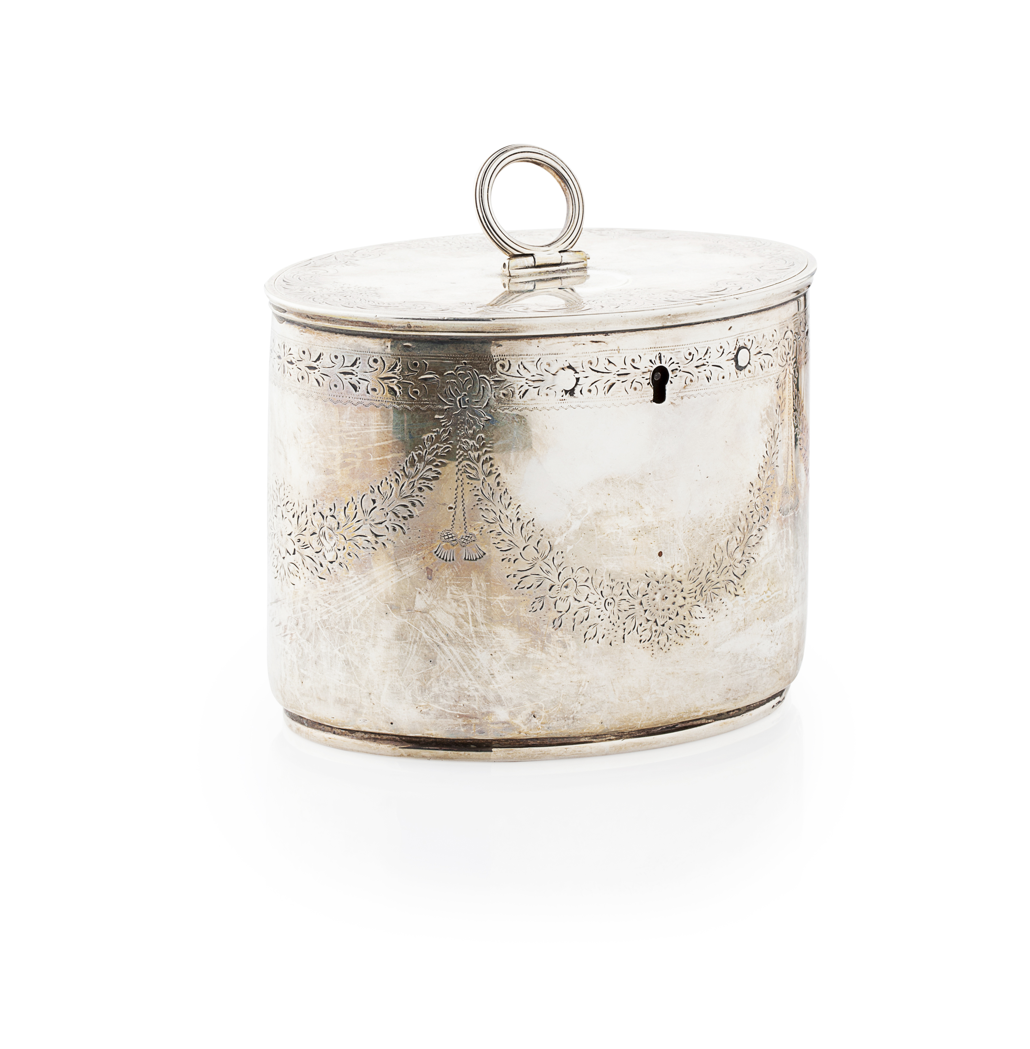 Andrew Fogelberg and Stephen Gilbert, London 1789, of oval form, the hinged cover with ring handle, the whole with bright cut engraved borders, lock and key