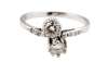 diagonally claw set with two round cut diamonds, the shoulders each set with two small round cut diamonds, to a plain white metal shank, unmarked