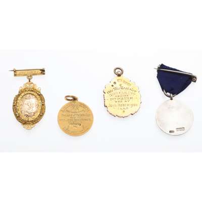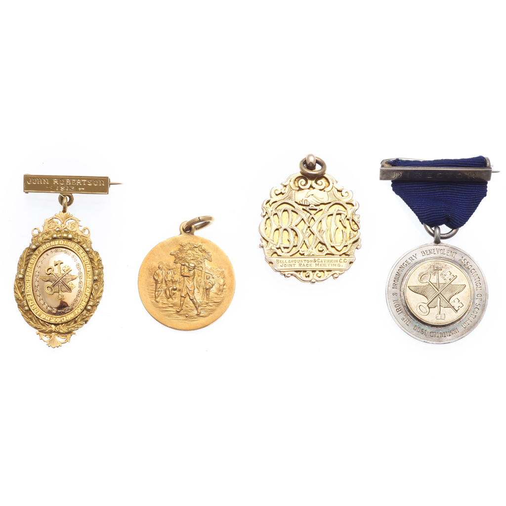 to include a circular 15ct gold golfing medal for 'The Laird Pollok's Cup' 1905; a 9ct gold cycling medal dated 1889, a 18ct gold pin badge circa 1912, relating to the Ironmongery Benevolent Association of Scotland; and another similar silver badge (4)