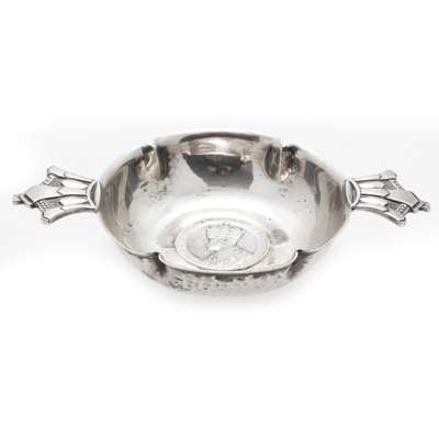 Robert Edgar Stone 1936, rose shaped bowl with crown shaped handles, image embossed to base of bowl, slightly hammered finish to underside with rose and crown detail, together with a contemporary mouse trap of plain box form, wire frame, makers mark only