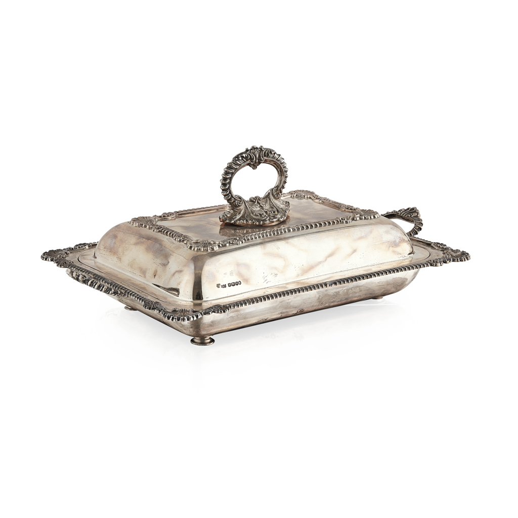 Mappin and Webb, Sheffield 1935, of conventional rectangular form, cast shell and gadroon border, leaf clasped removable handle, similar side handles, the liner pierced