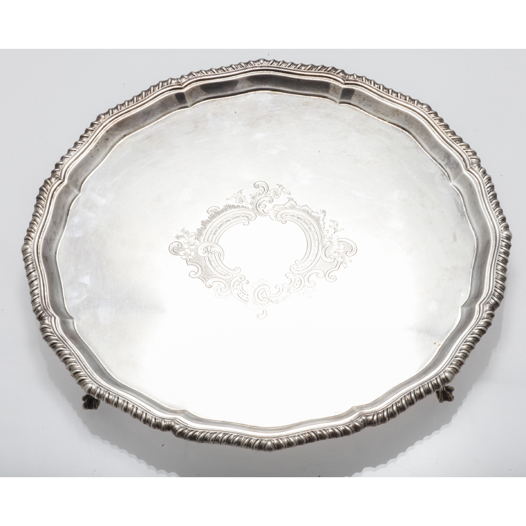 Robert Pringle & Sons, London 1935, of circular form with reeded detail to border, cartouche engraved to centre on the flat, raised on four claw ball feet