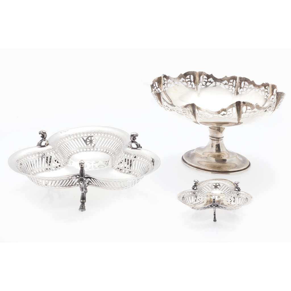Harrison Fisher & Co, Sheffield 1931, of lobed oval outline with pierced gallery, raised on a trumpet stem, together with a trefoil shaped fruit dish Atkin Brothers, Sheffield 1899, and a similar smaller example 1898 (3)