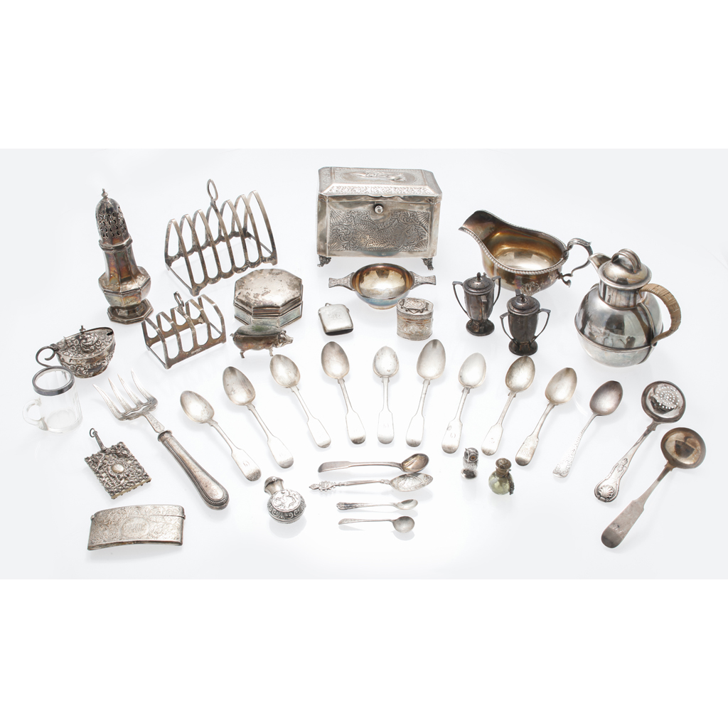 to include a rectangular silver box and cover, London 1927; a Jersey milk pot of traditional form; a sauce boat; a quaich; a sugar caster; two toast racks; vesta case; 'pig' pin cushion; Mary Gregory decorated glass scent bottle,; owl seal; another scent bottle; various boxes; odd flatware etc. (qty)