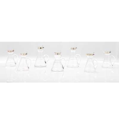 five John Grinsell & Sons, Birmingham 1924, each with glass body, of typical form, with star cut base, plain flat hinged cover and club shaped thumb-piece, two marked Mappin & Webb Ltd, Birmingham 1912, each with glass body, of typical form, with star cut base, plain flat hinged cover and thumb-piece (7)
