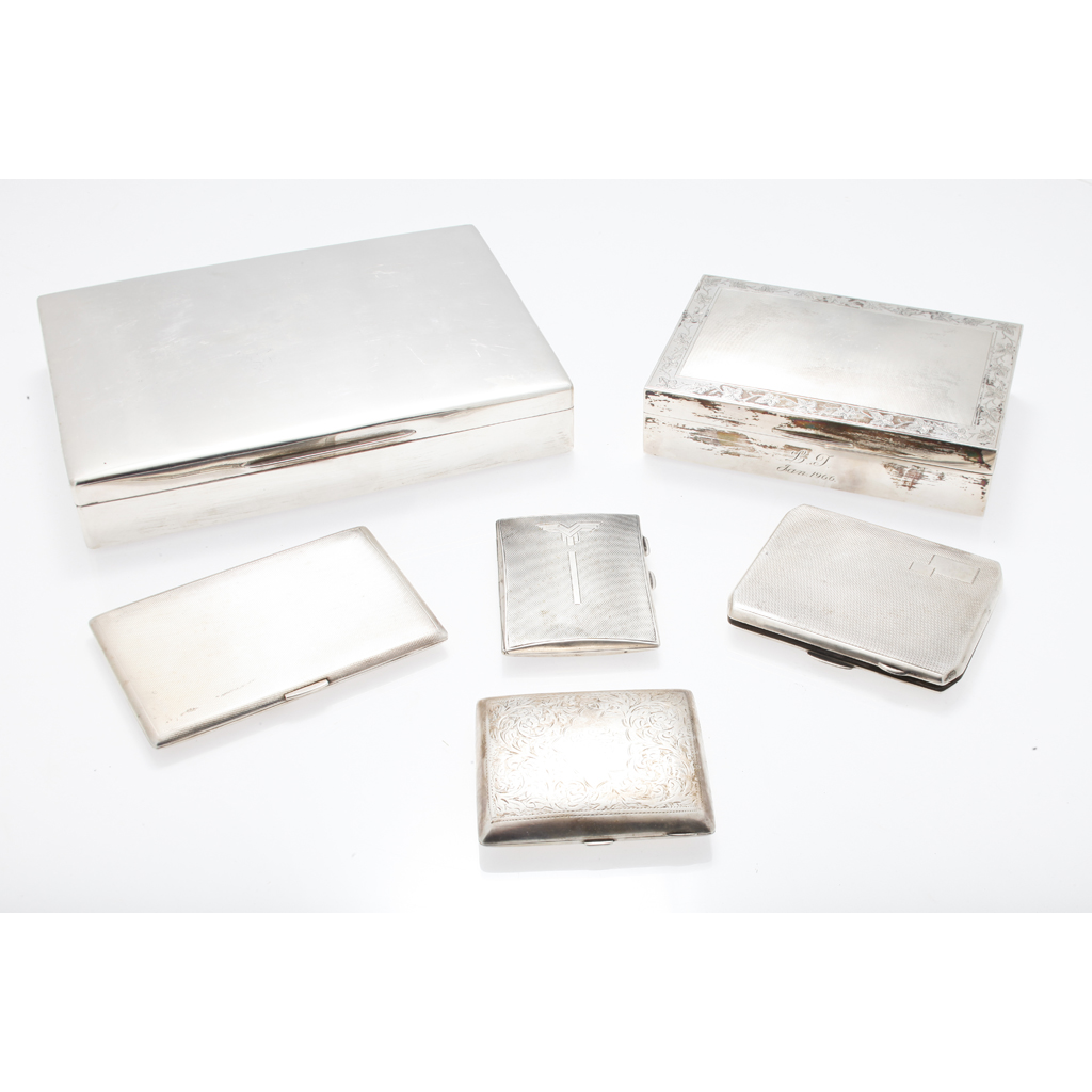 Charles & Richard Comyns, London 1922, of plain rectangular form with flange thumbpiece, wood interior lined, together with four smaller cigarette cases, various makers and dates, another silver table cigarette box with engine turned decoration to the top surrounded by a foliate border, engraving to the front (qty)