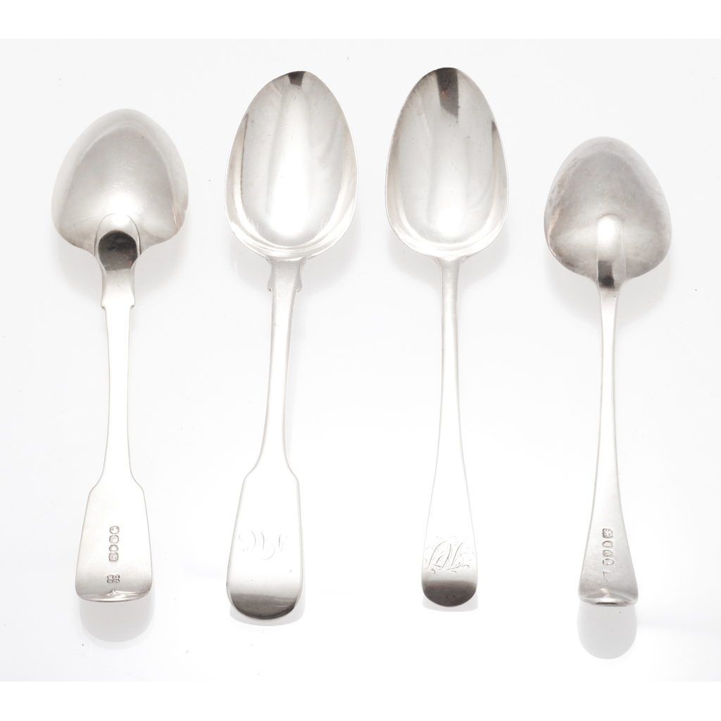 set of twelve table spoons of various makers and marks, primarily London, two Edinburgh with various signature engravings to the terminals (12)