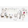 to include a silver bound common prayers and hymns pocket book, a cased set of salts, a collection of glass bottles with silver mounted tops; together with five thimbles, a tea strainer, collection of teaspoons and one fork; one salt with blue glass interior, a pin cushion and a vesta case (qty)