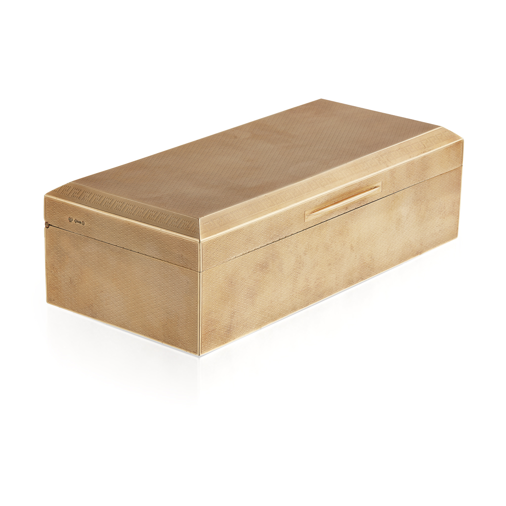 Retailed by Charles Packer & Co., London 1920, of rectangular form, hinged lid with three internal compartments, flange thumbpiece, engraved Greek key border and all over engine turned decoration